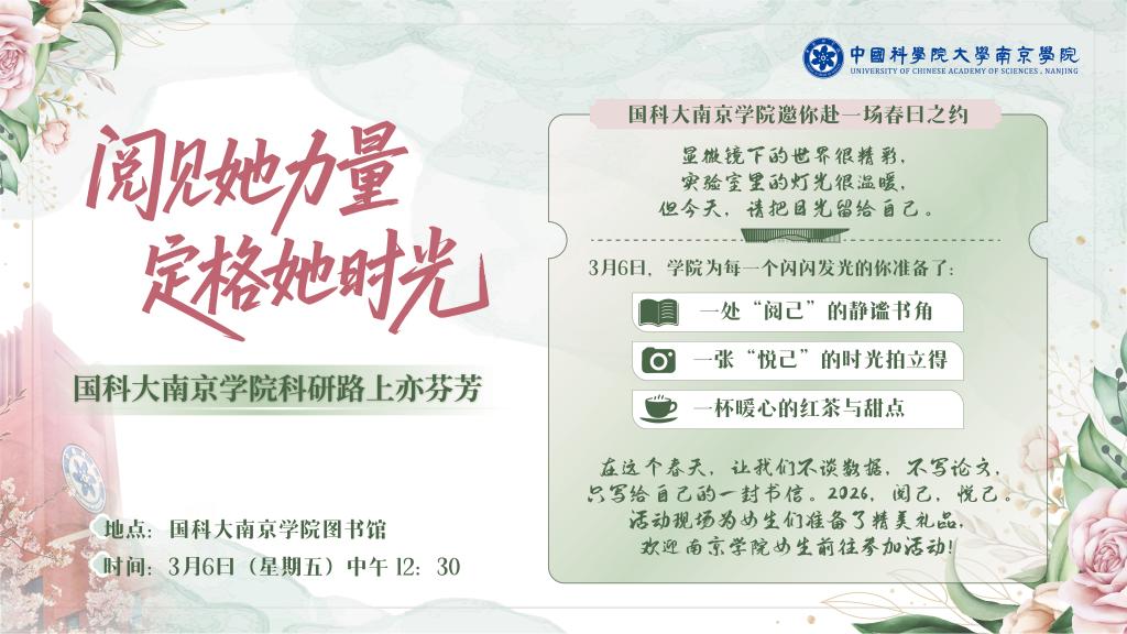校园活动 首页 - 校园生活 - 校园活动 - 正文 阅见她力量 定格她时光 活动日期 2026-03-06 12:30:00 主题:阅见她力量 定格她时光 地点:南京学院图书馆 时间:3月6日(星期五)12:30